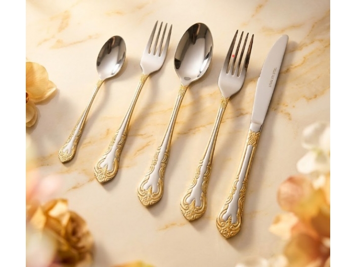 העיצוב האלגנטי כולל פס זהב עדין המשתלב בצורה הרמונית עם הגימור המלוטש של הסכו״ם, ומעניק מראה ייחודי שמתאים לאירוח חגיגי לצד שימוש יומיומי. כל פריט בסט מעוצב בקפידה לאחיזה נוחה ולחוויית שימוש מושלמת.