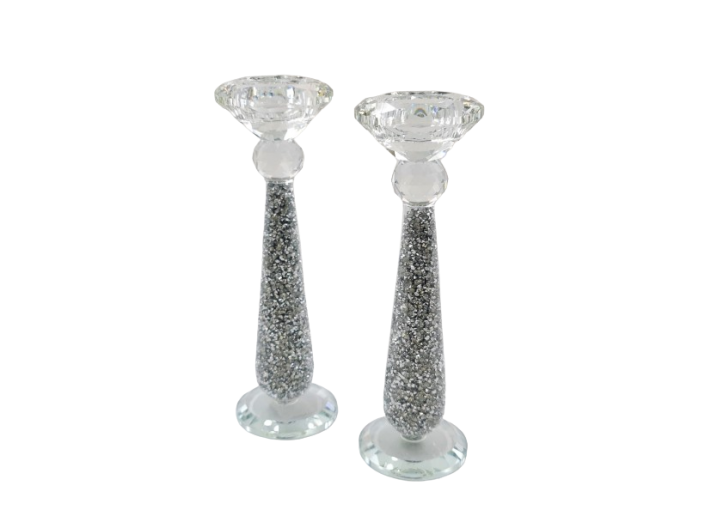 זוג פמוטי קריסטל במידה 22 ס"מ רסיסי כסף,כל פמוט קריסטל מגיע באריזה מיוחדת המגנה עליו ומאפשרת משלוח לכל חלקי הארץ,מתנה מרשימה לאירועים וחגים.